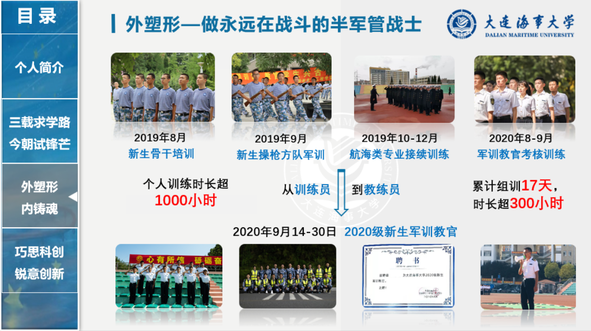 “外塑形,做永远在战斗的半军管战士”,在学校特色的半军事管理制度下,不断提高个人军政素质,全程参加了新生骨干培训班训练、新生军训、航海类专业接续训练,担任2020级新生军训承训教官,完成为期17天的新生军训任务,累计组训时长超300小时,发扬了海大“传、帮、带”的优良传统;担任学院学业咨询指导中心朋辈导师,负责日常答疑、考前知识点串讲,累计帮扶100余人次;担任学校资助宣传大使,开展送政策回母校活动,宣讲受众达200余人;坚信“集体是力量的源泉”,凝聚寝室力量,所在寝室参评2020-2021学年校十佳优良学风标兵寝室。