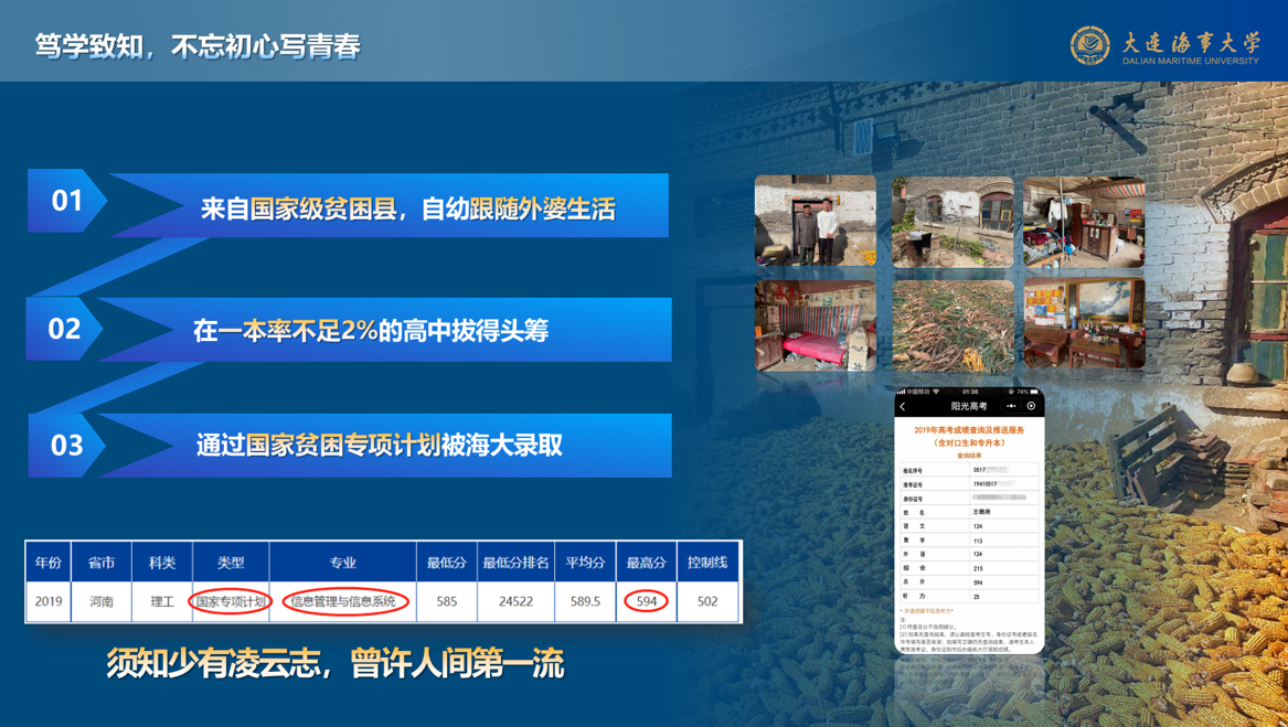 他来自国家级贫困县,自幼在农村生活,从小他就明白,只有努力学习才能走出农村、改变命运、报答社会,在一本过线率不足2%的高中母校以全校第一的成绩通过国家贫困专项计划被信息管理与信息系统专业录取。截止目前为止,平均学分绩点4.27,单学期最高绩点4.49,44门科目90分以上,29门科目95分以上,他成绩排名连续六学期专业第一,曾获小米特等奖学金(两万元,全校共五人)、国家励志奖学金、情商一等奖学金、校级三好学生、校级优秀团员等荣誉。三年来,他努力学习、踏实工作,累计获得奖助学金四万余元,支付了全额学费住宿费和大部分生活费用。