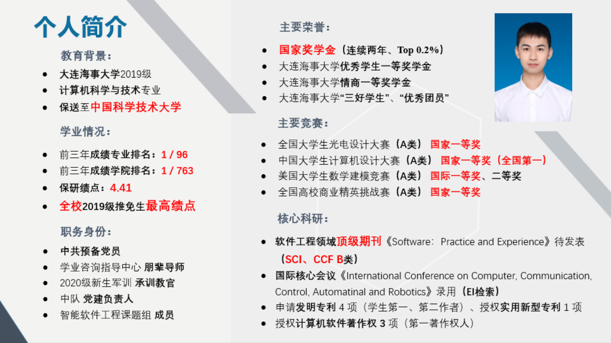 “今朝一试锋芒”,在保研推免中,获得清华大学、复旦大学、南京大学等顶尖高校的预面试资格,以优异成绩获得浙江大学、中国科学技术大学、中国科学院软件研究所、同济大学、国防科技大学、西安交通大学、南开大学等10余所985高校的预录取资格,最终选择保送至中国科学技术大学攻读硕士学位。