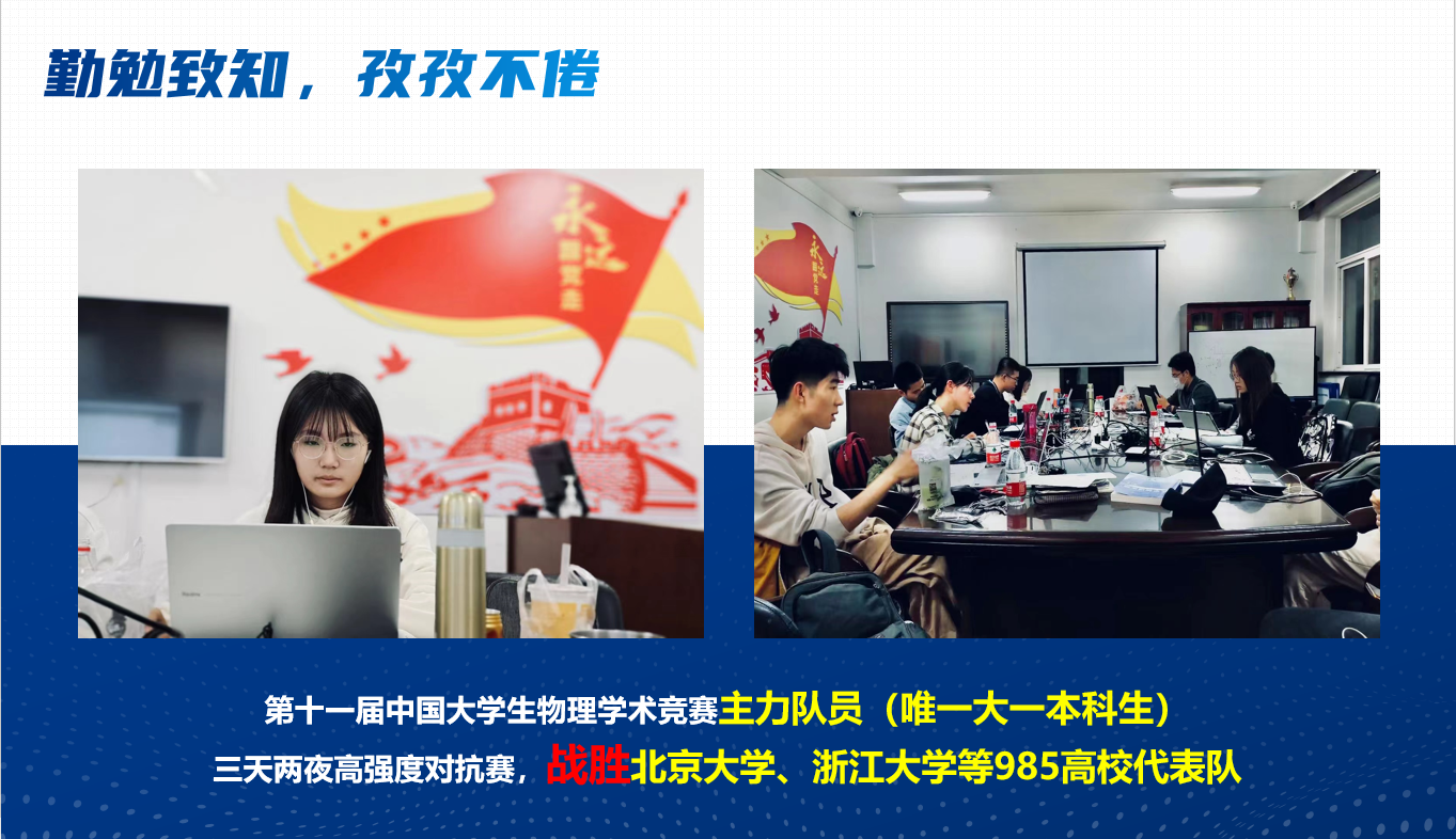 她共获得科创奖励28项,国家级奖项4项,主持国家级大创2项,省级大创2项,并获得破格保研资格。她曾作为主力队员中唯一的大一学生参加第十一届中国大学生物理学术竞赛,战胜北京大学、浙江大学等众多985院校代表队。
