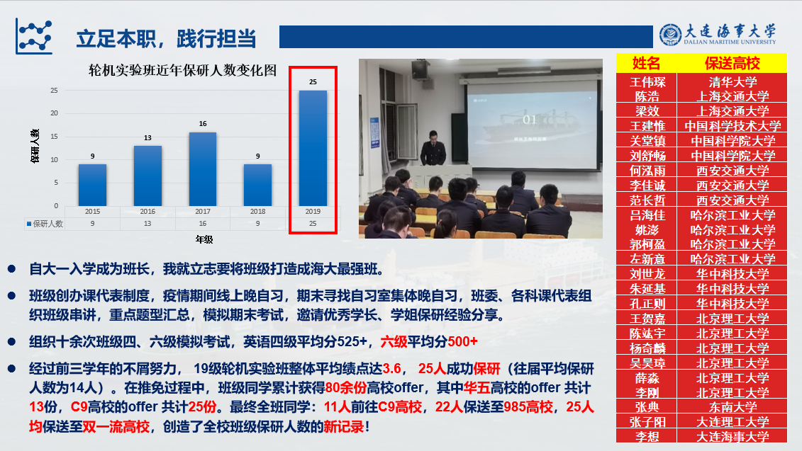 最终全班同学:11人保送至C9高校,22人保送至985高校,全员25人均保送至双一流高校,创造了全校班级保研人数的新纪录!作为班长,带领班级获评“优良学风标兵班”(连续两年)、“三好区队”(连续两年)、“大连市五四红旗团支部”等荣誉称号。