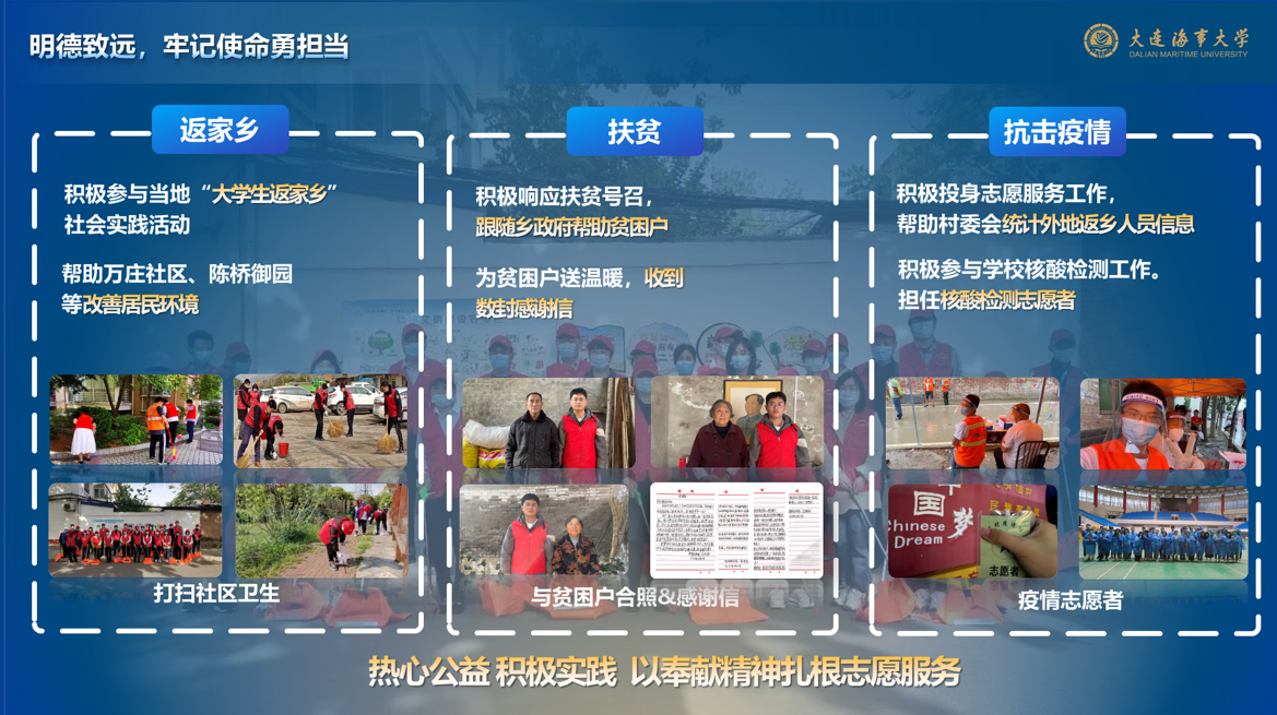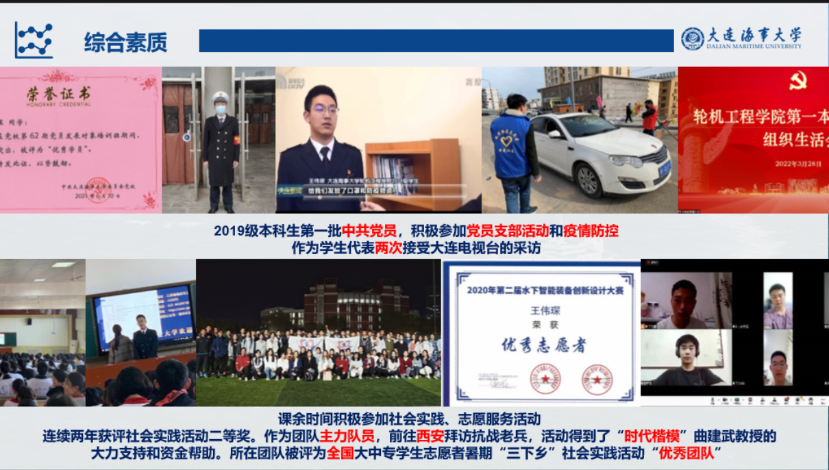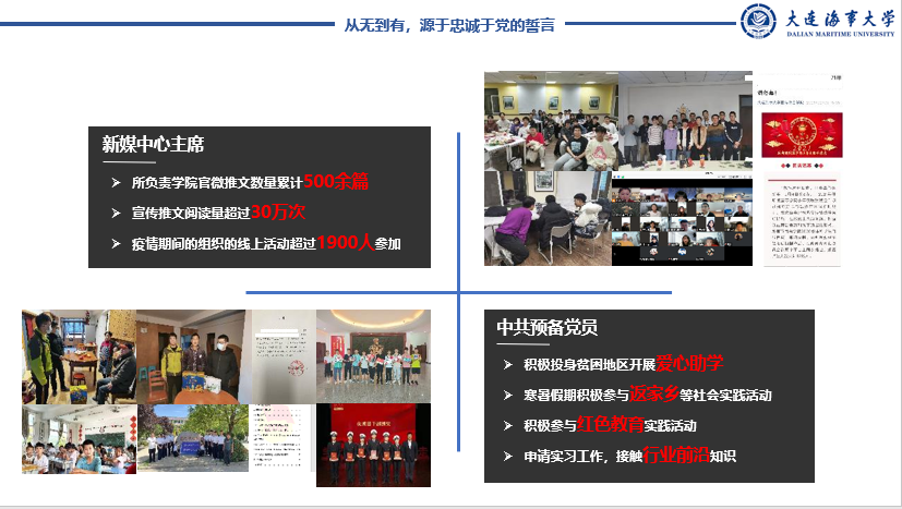 自递交入党申请书以来,始终以党员的标准严格要求自己,积极参加党团活动与志愿服务工作,入选中队首批中共党员。主动参与学校、学院组织的抗疫志愿活动,因表现突出,曾作为学生代表接受大连电视台的采访。