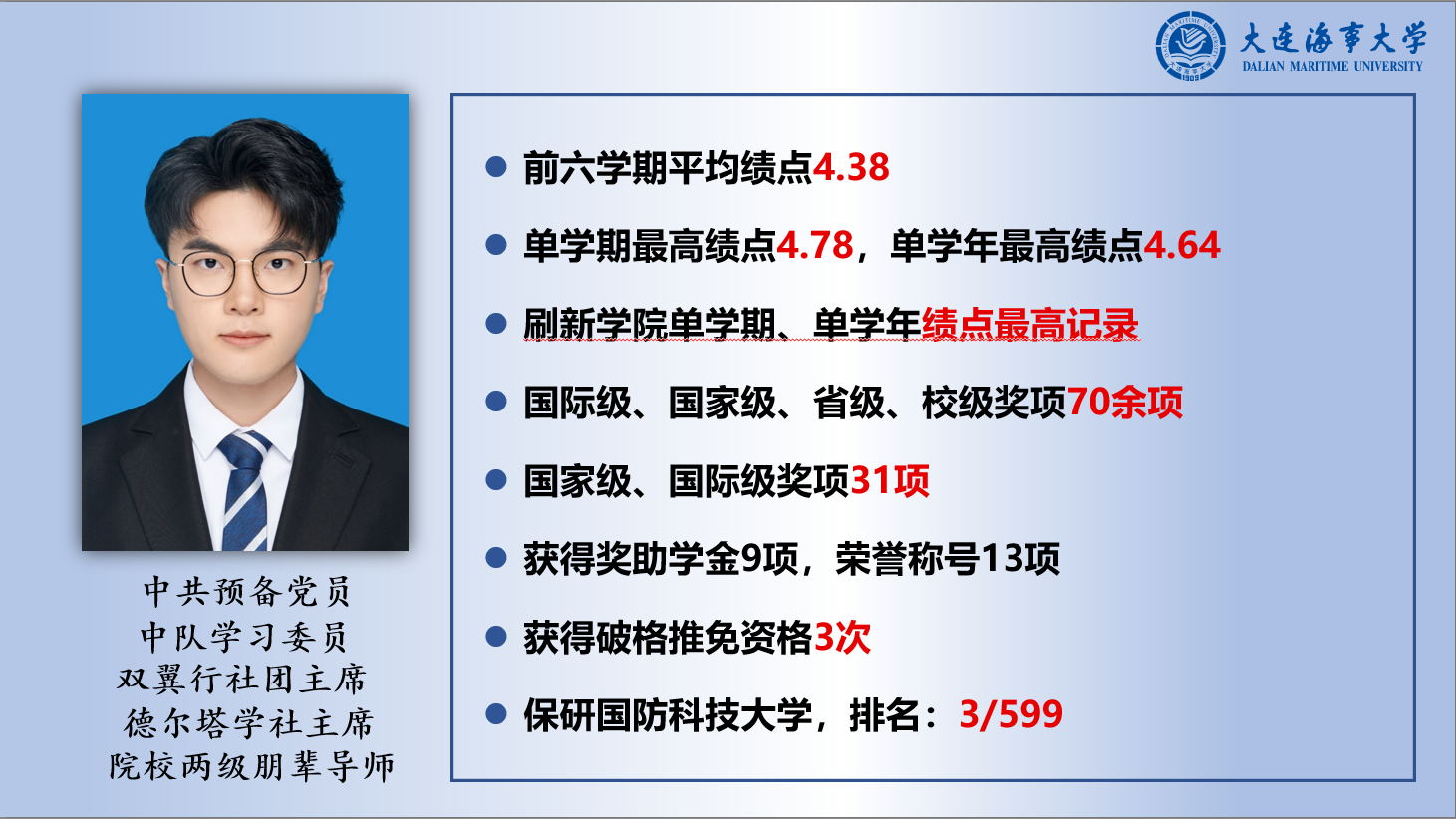 他前三学年平均绩点4.20,单学期最高绩点4.46,连续两年综合排名专业第一,累计55门课程90分以上,31门课程接近满分。获得国家(际)级奖项17项,省部校级奖项30余项,累计获得学校破格推免资格2次。主持参与国家级大创项目2项,获科技创新等各类奖学金3.8万元。