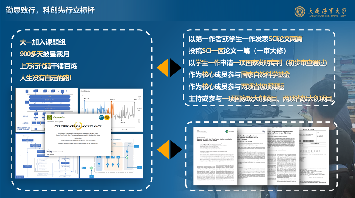 加入学校智能软件工程课题组,跟随郭世凯、李辉老师开展科研学习,深度参与国家青年自然基金1项,1篇SCI论文在投,受理发明专利2项,授权计算机软件著作权3项;同时在专业课老师的指导下强化交通规划方向的知识,以第一作者身份发表EI检索论文2篇,均已录用见刊。在研究生推免阶段获得浙江大学、北京航空航天大学、同济大学、中山大学等多所985院校offer,最终选择热爱的同济大学智能交通方向攻读硕士学位,为交通强国建设贡献青春力量!