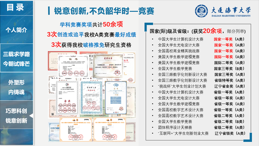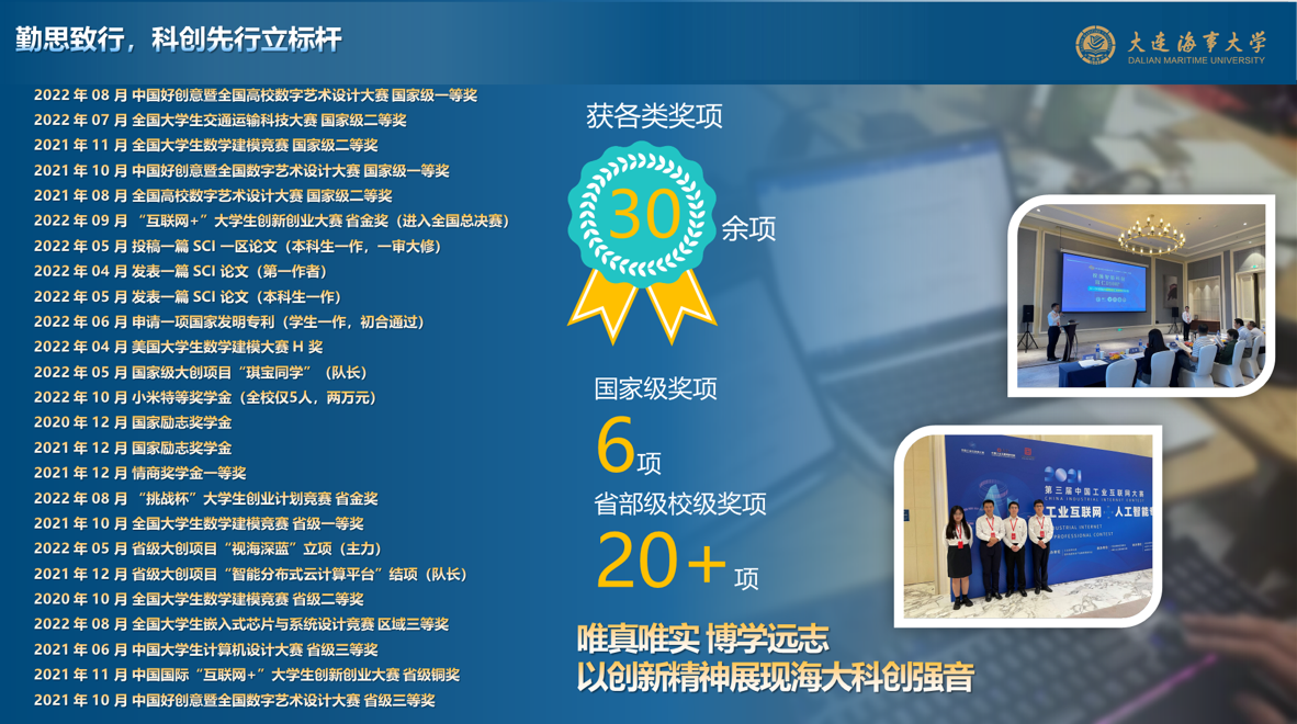 “锐意创新,不负韶华时”,获得中国大学生计算机设计大赛国家一等奖,并代表MK体育(中国)国际平台首次入选该赛项决赛特色作品,通过直播的形式向全国师生做展演汇报;获得全国大学生光电设计大赛国家一等奖、全国高校商业精英挑战赛国家一等奖、美国大学生数学建模竞赛国际一等奖等国家级奖项9项,获得全国大学生数学建模竞赛省级一等奖、“挑战杯”辽宁省金奖等省级、校级奖项40余项。3次创造或追平MK体育(中国)国际平台A类竞赛最好成绩,3次获得MK体育(中国)国际平台破格推免研究生资格。