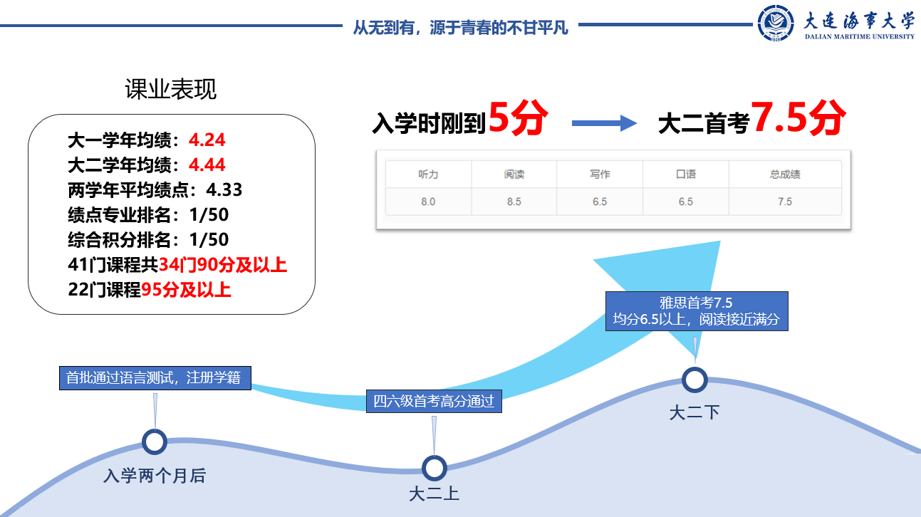 大一入学时他的英语水平很差,雅思测试成绩刚到5,但面对除了思政体育,近乎都为全英授课的培养计划,他并没有退缩,而是迎难而上。他前两年平均绩点4.33,单学年最高绩点4.44,综合排名和学业排名均列专业第一,所修41门课程中,34门90分以上,22门95分以上。他是学院首批通过语言测试的学生,一次性通过四级(583)、六级(553),雅思首考7.5,各小分均在6.5及以上。