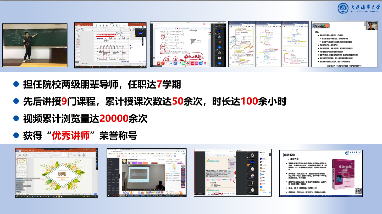 他先后担任中队学委、学社主席、双翼行社团主席、“一直播”主播等6项职务,每一个角色都赋予了他不一样的意义。他加入学校和学院的学业指导中心,成为院校二级朋辈导师。两年,7个学期,他累计辅导学生1000余名,讲授课程9门,直播授课与录制视频累计浏览量达2万余次,荣幸受同学们邀请在线直播授课。作为一名共产党员,疫情期间他积极参加学校的核酸检测工作,累计服务时长达40余小时。作为家乡“归雁”志愿服务队队长,返乡后主动加入村口疫情监测岗,累计服务时长达120余小时。