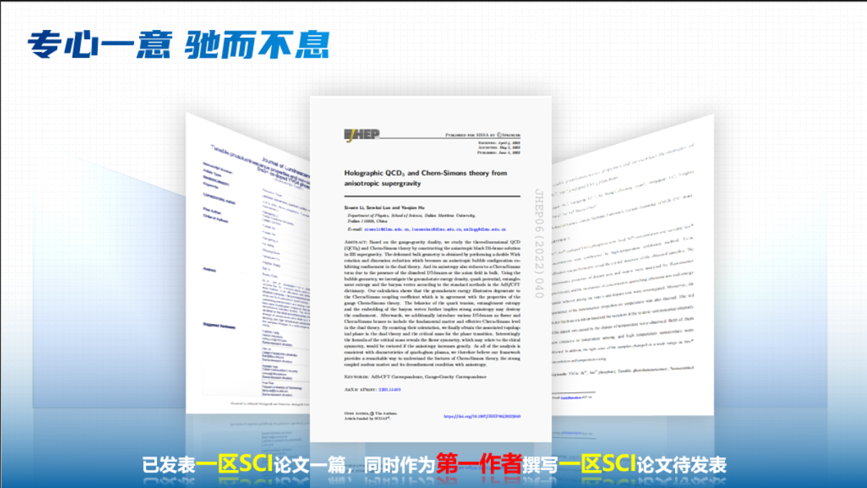 大一加入大连市海洋微纳能源与自驱动系统重点实验室,跟随徐敏义老师、王昊老师开展科研学习,已发表SCI(JCR Q1)论文两篇,其中一篇为共同第一作者,发表英文会议论文2篇,申请国家发明专利2项,实用新型专利2项。积极参加各类竞赛,共获国家级13项,省级10项奖项、荣誉,获得成绩与竞赛双重保研资格。推免阶段获得清华大学、上海交通大学、浙江大学等6所知名学府offer。最终保研至清华大学,攻读电子信息专业海洋技术与工程方向硕士研究生。