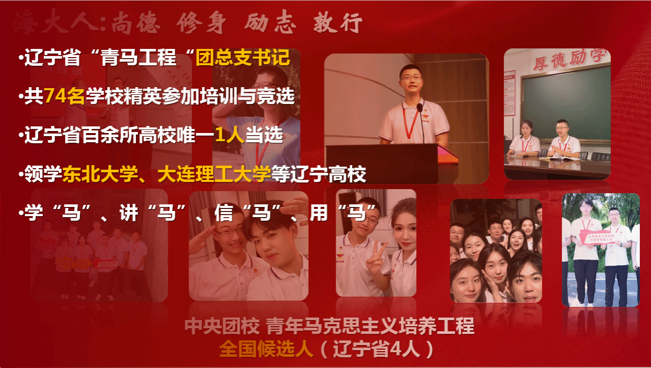 他始终坚定不移听党话、跟党走,获得2023年中央团校“青马工程”候选人资格(全省仅4人),并当选辽宁省“青马工程”团总支书记,以海大青年身份引领辽宁省百余所高校学员学“马”、讲“马”、信“马”、用“马”。在国家级、省级平台上展现着海大青年的风采,用实际行动书写着“请党放心,强国有我”的铮铮誓言。