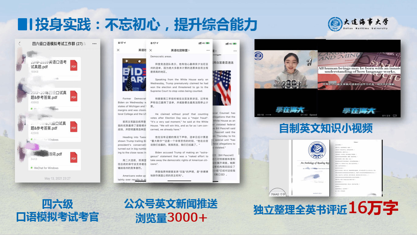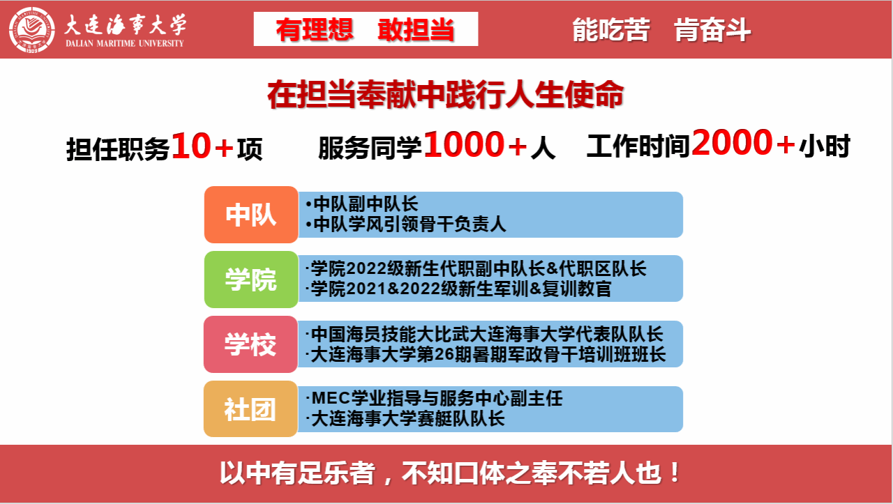 在激荡的时代浪潮中勇担使命。以职场精英挑战赛第一名、唯一一名实习生的身份入选大型央企实习,与东北发展同频共振;作为大连站唯一一名入选志愿者,统筹近千人大型赛事秩序;入选山东省省运会志愿者,服务100余名运动员、技术官员,登上“笑脸里的幸福故事”专题报道。