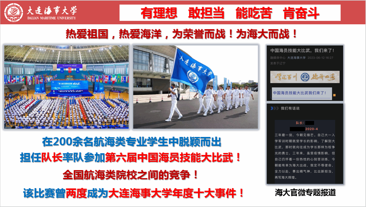 他(她)们砥砺前行,无问东西;他(她)们向阳而生,追光筑梦;他(她)们立爱国之志,成报国之才,将个人理想融入国家发展,用奋斗照亮青春;他(她)们怀抱梦想又脚踏实地,用行动彰显新一代海大人的使命与担当;他(她)们敢想敢为又善作善成,在国际和国家各类赛事中发出“海大青年最强音”。