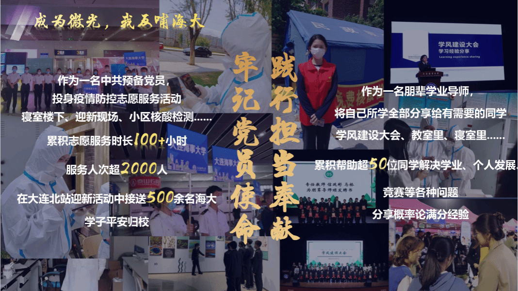 她还担任院校两级朋辈学业咨询导师,她将自己总结的学习资料、竞赛经验无偿分享给有需要的同学,耐心解决学弟学妹学习生活中的疑问和困惑。生在红旗下,长在春风里,四年的海大学习生活,她在各个岗位上做出了积极的贡献,展现了自己的才华和能力。她常说,我是千千万万海大青年中的一员,有海大才有我们,无论是学术上的指导还是生活上的关照,海大,都给予了我们无微不至的关怀!