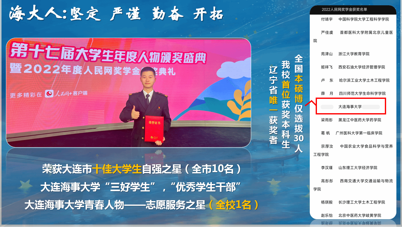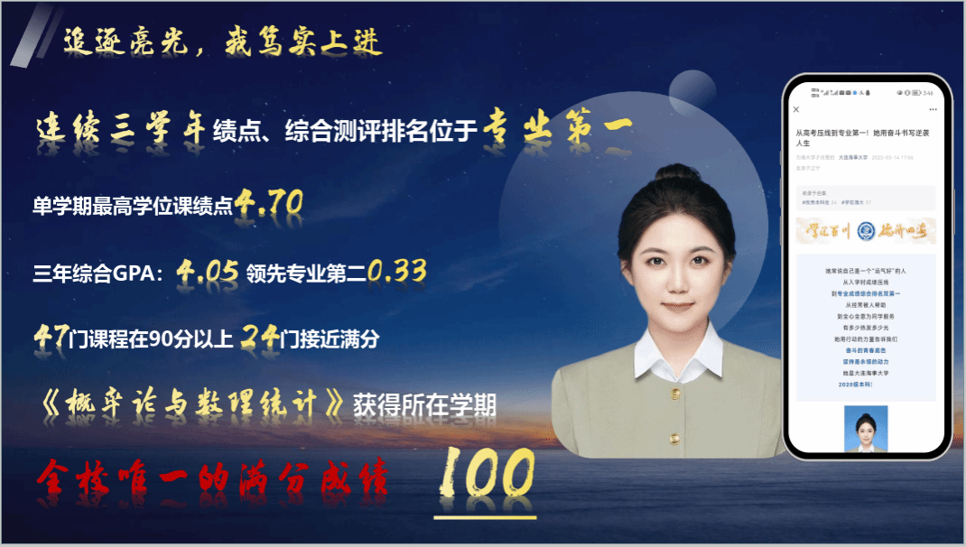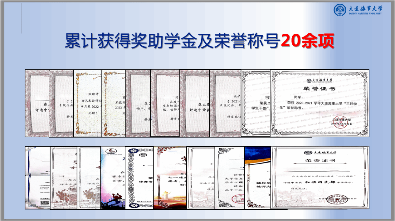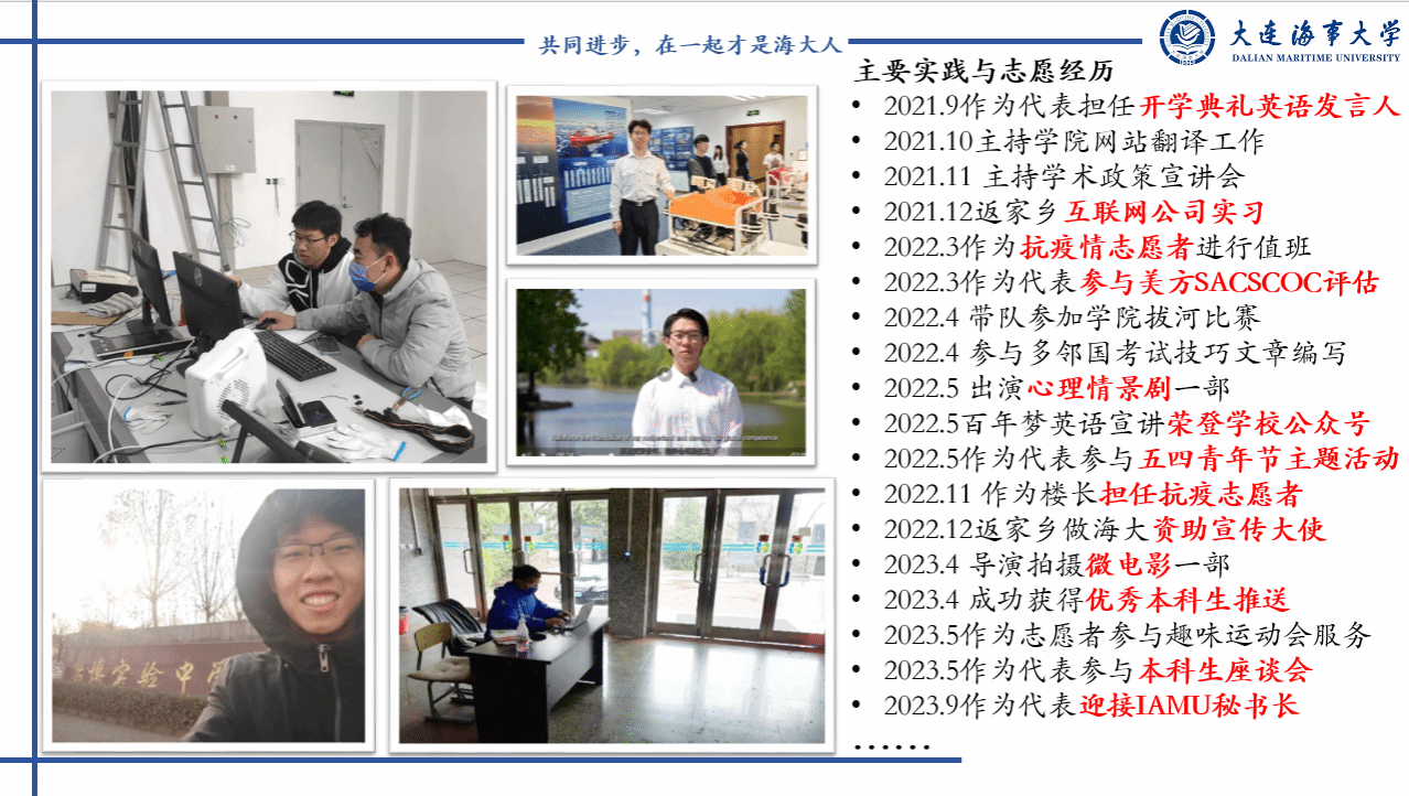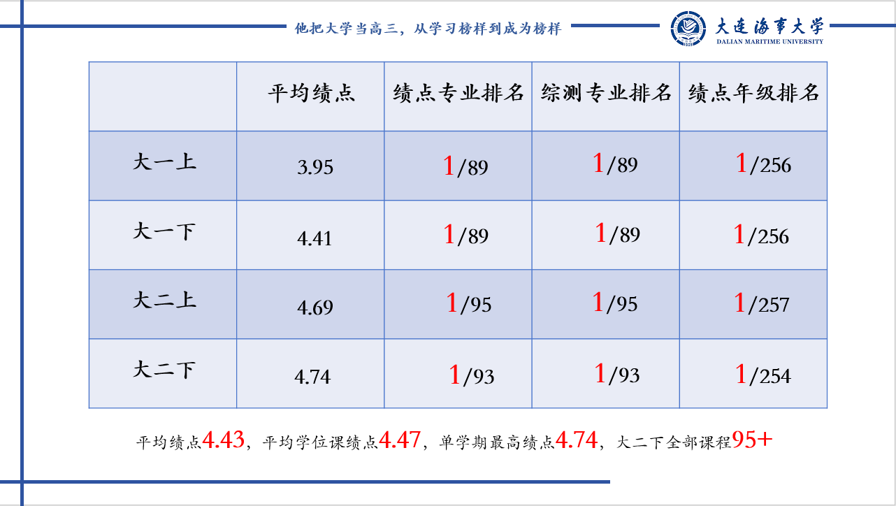 他奋楫笃行,勤勉自律,前两学年平均绩点为4.43,学位课平均绩点为4.47,单学期最高绩点为4.74。绩点排名连续两学年专业第一(1/93),综合积分排名连续两学年专业第一(1/93),绩点连续两学年为年级最高(1/254),在所学课程中,34门课程达90分以上,其中26门课程达95分以上,11门课程接近满分。2023年8月,他获得国际海事大学联合会(NF-IAMU)学生奖学金,此项奖学金2023年全球仅11人获得,金额约为12万元人民币。他还获得国家奖学金、三好学生、优秀团员等荣誉。他英语水平突出,雅思首考取得6.5分。参加科创竞赛30余项,获得国家国际级奖项3项、地区级奖项1项、省级奖项18项。
