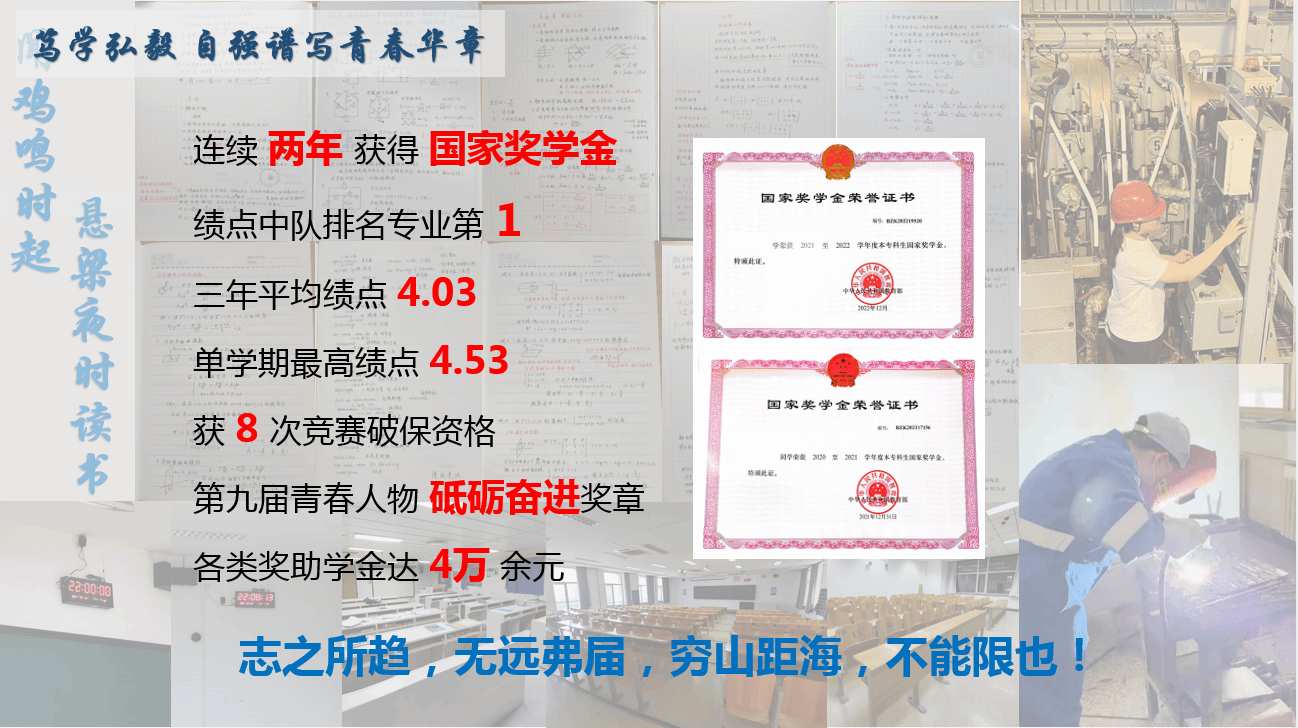 莫问前程几许,只顾风雨兼程。初入大学,他也曾感到迷茫。转专业后,成绩排名一度落后至专业第九,但他很快调整了自己的学习节奏,奋起直追。他大学前三年成绩排名1/136,单学期最高绩点4.54,45门课程达到90分以上,连续两年综合成绩排名专业1/136,曾获得国家奖学金、校“三好学生”、校“优秀学生干部”、社会实践“优秀个人”等荣誉及称号,思想积极向上、求学态度端正。