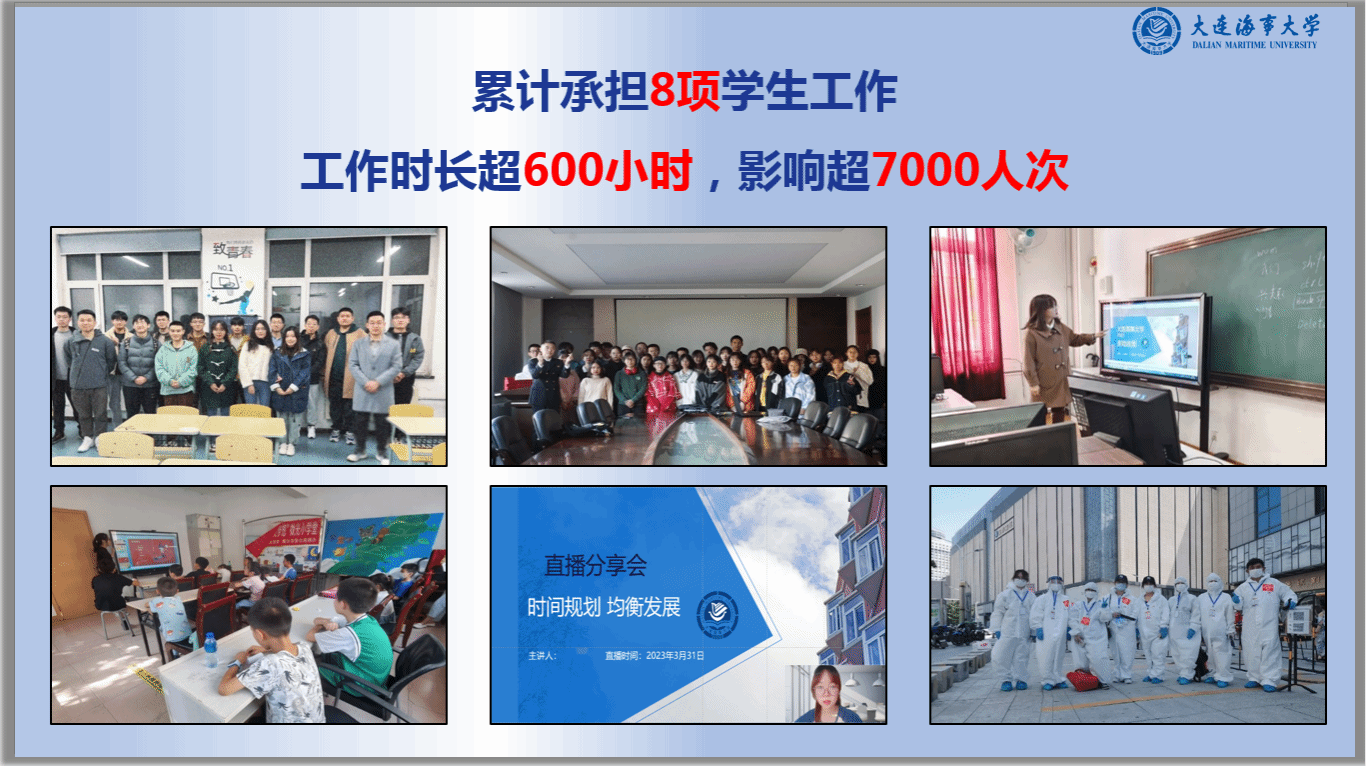 作为校大学生记者团团长,她记录美丽海大、分享传奇故事,荣获“优秀学生记者、编辑”,社团荣获优秀组织奖、图片类“好新闻奖”等荣誉;作为学院团委学生会主席,举办四项科创比赛、十余次读书观影活动,影响近2000人次,获评“优秀学生干部”、“优秀组织者”荣誉称号,此外参与组织学院代表队参加的“逐梦杯”比赛获二等奖,突破近几年学院最好成绩,为学院全面发展贡献力量;作为中队组织委员暨班级宣传委员,累积拍摄图片近2000张,整理文件100余项,同时参与组织中队承接辽宁省高校网络思想政治工作等系列活动。在代表学院参加职业生涯规划大赛时,荣获复赛一等奖、决赛二等奖,突破学院学生近几年最好成绩。