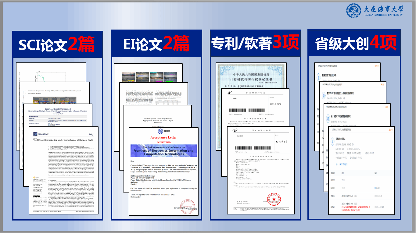 潜心科研,锲而不舍。她深度参与实验室横、纵向课题4项,从船舶图像检测,到港口场桥调度,再到水下光学相机设计,涉猎电子信息、计算机、航运管理等6个专业,她从零摸索开发板、自学编程语言,实验测试上百次,处理图像上千张,书写代码上万行。发表SCI论文2篇、EI论文2篇,申请专利和软件著作权3项,主持及参与省校级大创项目4项。为拓宽自己知识的广度,她也积极参加各类学科竞赛,做到学以致用。连续两年获得美国大学生数学建模大赛国家级一等奖,累计获得校级及以上奖项50余项,包括国家级奖项5项,省级奖项15项。