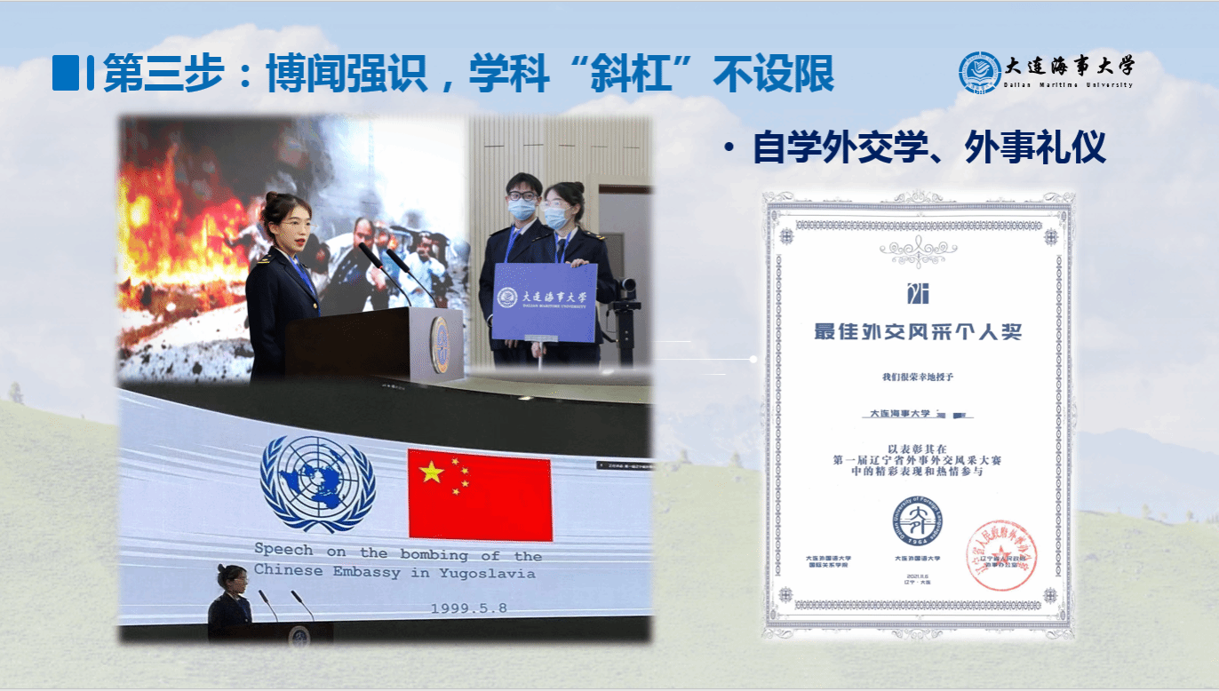 辩论攻坚,磨砺逻辑之刃,博闻强识,拓宽国际视野。深知功夫在课外,自大一起,她便积极参加各类英语演讲辩论赛时,至今已参与逾100场次英语辩论,30余场英语演讲。曾以第七名斩获中国奥林匹克英语辩论赛一等奖、“最佳辩手”称号,于2023年以华北17强晋级“外研社·国才杯”全国大学生英语辩论赛总决赛,并获全国二等奖;2021年获得中国大学生英语辩论赛全国三等奖(华北16强),她深知涉外律师应树立敏锐的国际眼光,通晓国际规则,她自学外交学,参加辽宁省外事外交大赛,以辽宁省第一名获得“最佳外交风采个人”奖,此外,还获得21世纪杯英语演讲比赛省级二等奖、大连市枫叶杯英语演讲比赛市三等奖。