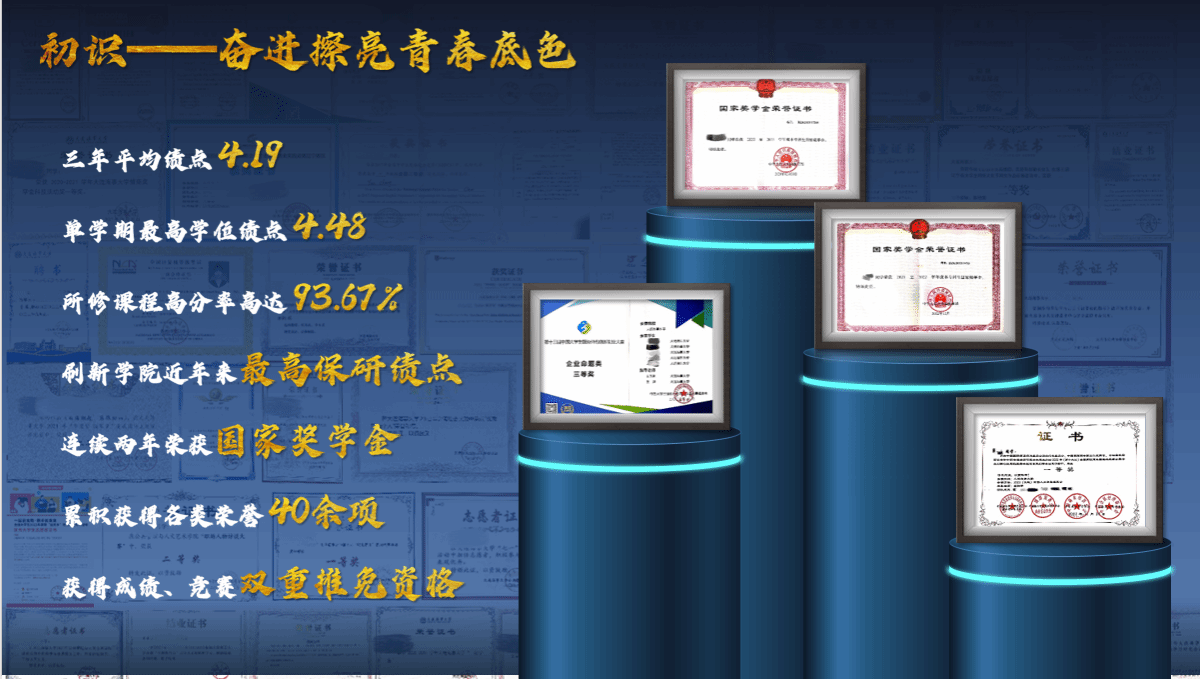徐润昕怀抱梦想又脚踏实地,前三学年单学期最高平均绩点4.41,综合排名1/376。获得人民网奖学金(辽宁省唯一获奖)、国家奖学金、全国“时代楷模”曲建武励志基金等多项奖学金,共计4万余元。