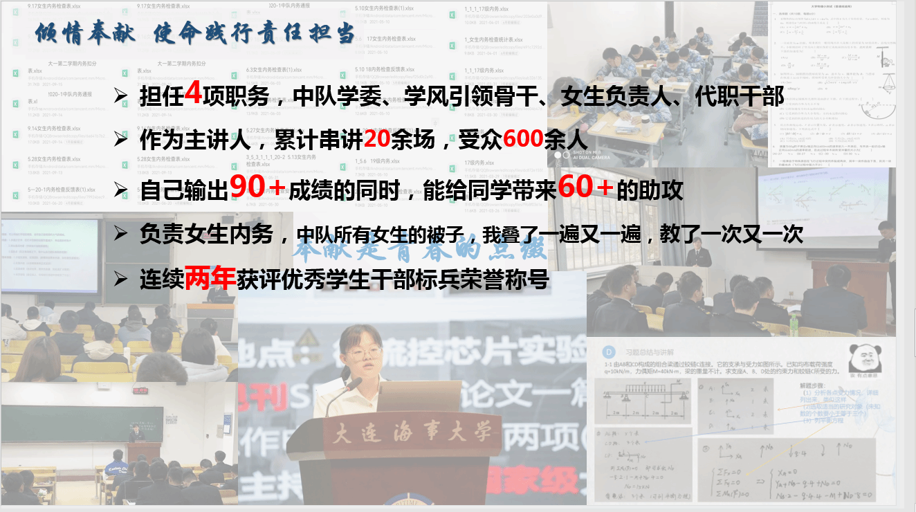 倾情奉献,使命践行责任担当。作为一名海大学子,她时刻牢记着家乡、海大、祖国的资助,“总要做点什么”的念头常怀她心间,她要用青春的汗水去践行责任担当。在校内她担任到多个学生工作中去,中队学委,学风引领骨干,女生负责人,代职干部。作为主讲人,针对重点科目进行复习串讲,在自己输出90+成绩的同时,能给同学带来60+的助攻。负责女生内务,累计汇总内务检查表格近200份,高效的完成学校学院交于的任务,连续两年获优秀学生干部标兵。