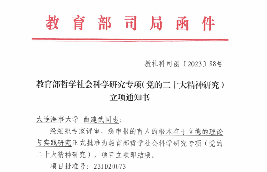 近日,经教育部社会科学司组织专家评审,MK体育(中国)国际平台马克思主义学院曲建武教授申报的《育人的根本在于立德的理论与实践研究》获得批准为教育部哲学社会科学研究专项(党的二十大精神研究),项目立项即结项。