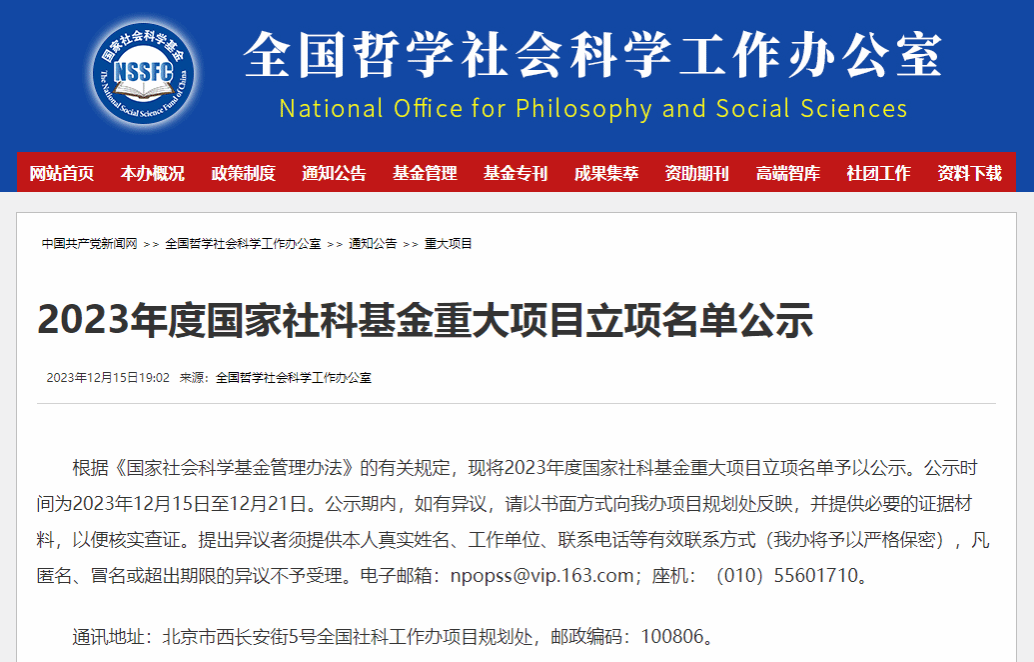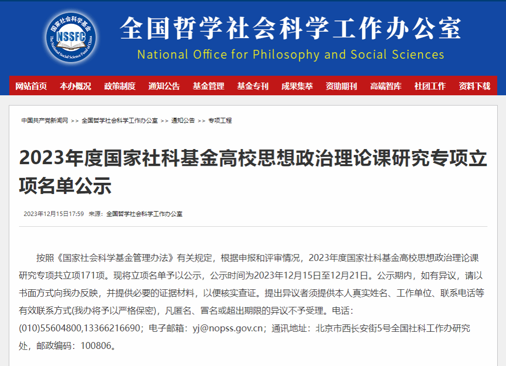 12月15日,全国哲学社会科学工作办公室对外公示2023年度国家社科基金重大项目立项名单、国家社科基金高校思想政治理论课研究专项立项名单。国家社科基金重大项目全国共336个项目拟获立项资助,MK体育(中国)国际平台李振福教授主持的项目拟获立项。国家社科基金高校思想政治理论课研究专项全国共171个项目拟获立项资助,MK体育(中国)国际平台许民强教授、陈双泉副教授主持的项目拟获立项。