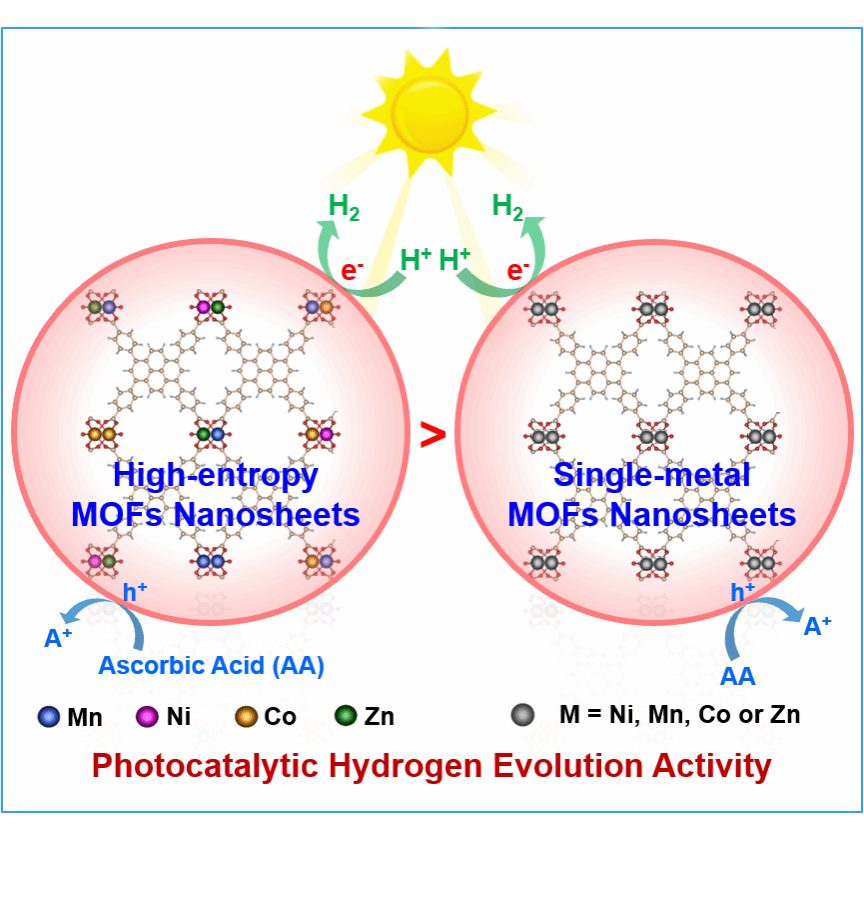 近日,轮机工程学院船舶洁净能源研究中心宗旭教授团队在可再生能源制氢研究方面取得进展,相关研究成果以“Water-Stable High-Entropy Metal-Organic Framework Nanosheets for Photocatalytic Hydrogen Production”为题发表于国际顶级期刊Advanced Materials(影响因子:27.4)。