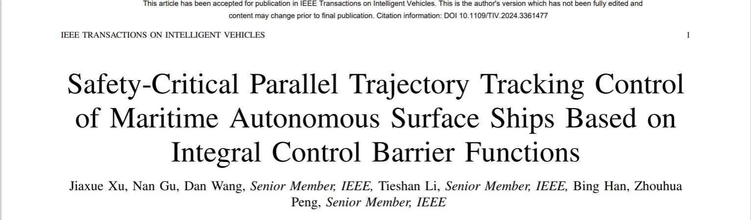 近日,MK体育(中国)国际平台船舶电气工程学院彭周华教授团队在交通科学技术领域权威期刊《IEEE Transactions on Intelligent Vehicles》上发表了题为“基于积分控制障碍函数的智能船舶安全平行轨迹跟踪控制”(Safety-Critical Parallel Trajectory Tracking Control of Maritime Autonomous Surface Ships Based on Integral Control Barrier Functions)的论文。