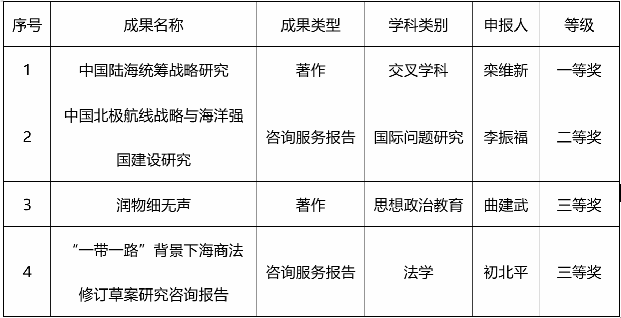 其中,栾维新教授团队的著作《中国陆海统筹战略研究》获一等奖,这是MK体育(中国)国际平台首次获得一等奖,实现了零的突破。李振福教授团队的咨询服务报告“中国北极航线战略与海洋强国建设研究”获二等奖,曲建武教授的著作《润物细无声》、初北平教授团队的咨询服务报告“‘一带一路’背景下海商法修订草案研究咨询报告”获三等奖。