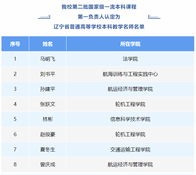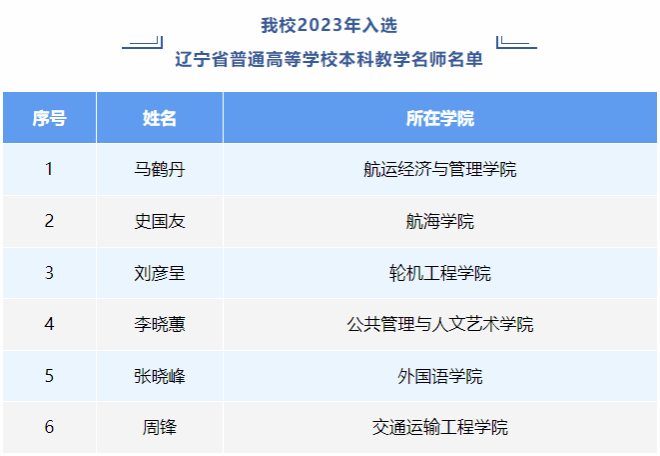 近日,辽宁省教育厅发布《关于公布2023年辽宁省普通高等学校本科教学名师遴选结果的通知》(辽教通〔2024〕56号)、《关于认定第二批国家级一流本科课程第一负责人为普通高等学校本科教学名师的通知》(辽教通〔2024〕55号),MK体育(中国)国际平台共14名教师入选,其中学校推荐的马鹤丹等6名老师全部获评教学名师,第二批国家级一流本科课程第一负责人马明飞等8位教师被认定为辽宁省本科教学名师。