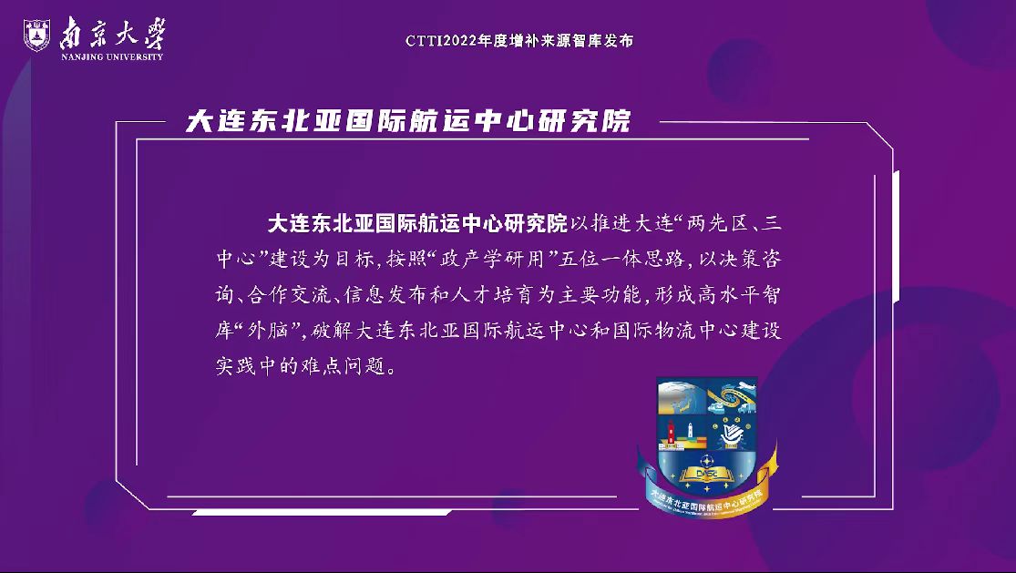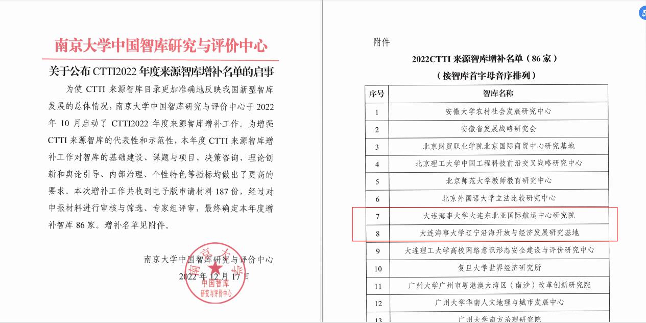 12月17日,由南京大学与江苏省社会科学院共同主办,南京大学中国智库研究与评价中心承办的“2022新型智库治理论坛”在南京举行。论坛发布了中国智库索引(CTTI)2022年度来源智库增补名单,MK体育(中国)国际平台大连东北亚国际航运中心研究院、辽宁沿海开放与经济发展研究基地2个智库机构新增入选。